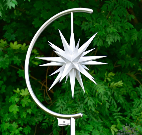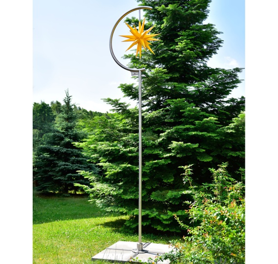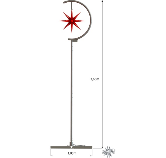 Die Leuchte kann ortsfest montiert (verschraubt) oder als mobile Version über Betonbodenplatten befestigt werden. Bodenplatten sind nicht im Lieferumfang enthalten. Der passende Herrnhuter Stern A7 ist im Lieferumfang enthalten. Am Bogen der Standleuchte befindet sich ein Zackenansatz, der die Farbe des Sterns vorgibt.
