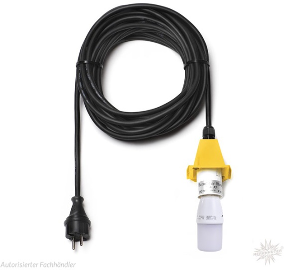 10 m lang inklusive LED 470–500 Lumen (Abbildung kann abweichen) für 230 V mit Fassung E27, Schuko-Stecker und farbiger Abdeckkappe (passende Farbe oben auswählen).