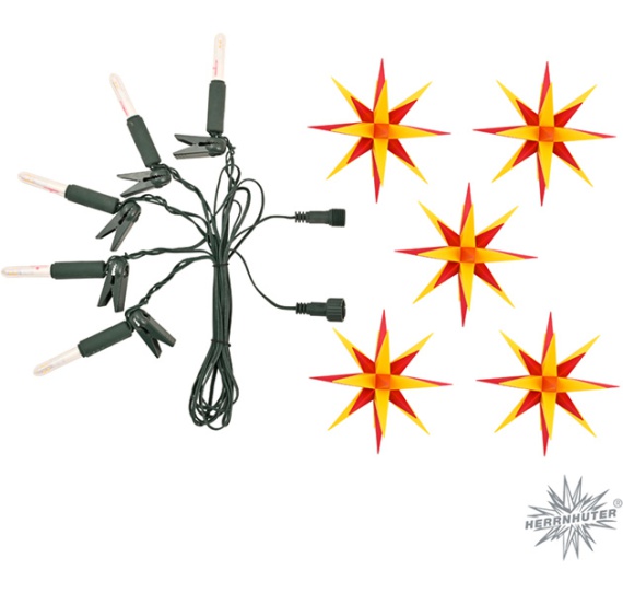 5 Kunststoffsterne, ca. 13 cm ø - zum Aufstecken auf mitgelieferte Lichterkette (230 V)